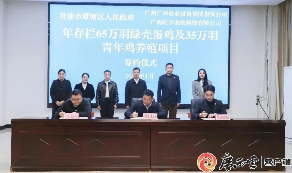 1月20日,贵港市覃塘区人民政府与广州广兴牧业设备集团有限公司、广西旺昇农牧科技有限公司举行年存栏65万羽绿壳蛋鸡及35万羽青年鸡饲养项目签约典礼。项目的成功签约,标志着覃塘区蛋鸡规划存栏量跃升至1800万羽,为广西最大禽蛋生产基地建造注入微弱动能。