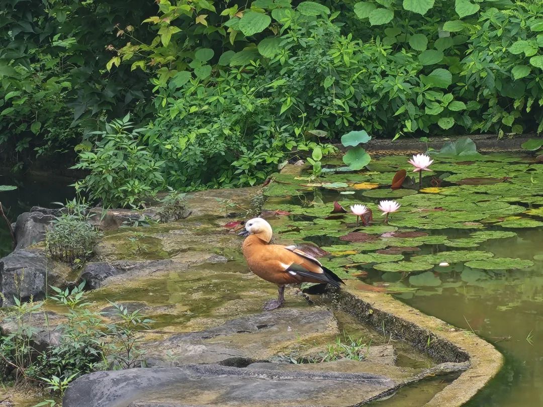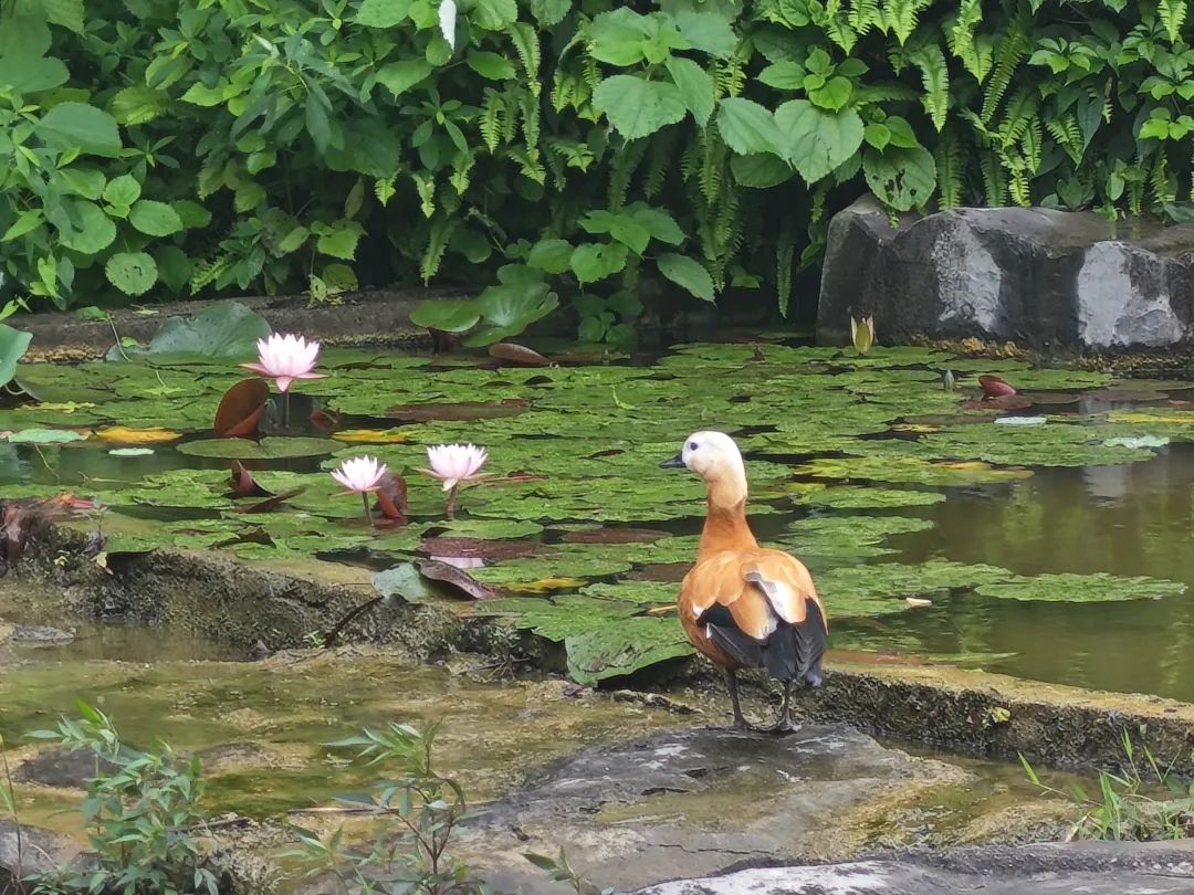 5月20日上午,记者来到七星景区骆驼山下,在荷花池旁见到了这只赤麻鸭。当时天空正下着小雨,赤麻鸭正在岩石上整理自己的羽毛。雨势渐小,赤麻鸭振翅滑翔入水,灵活地在荷叶间寻找鱼虾,它黑白橙三色的身影在绿水青山中十分醒目。